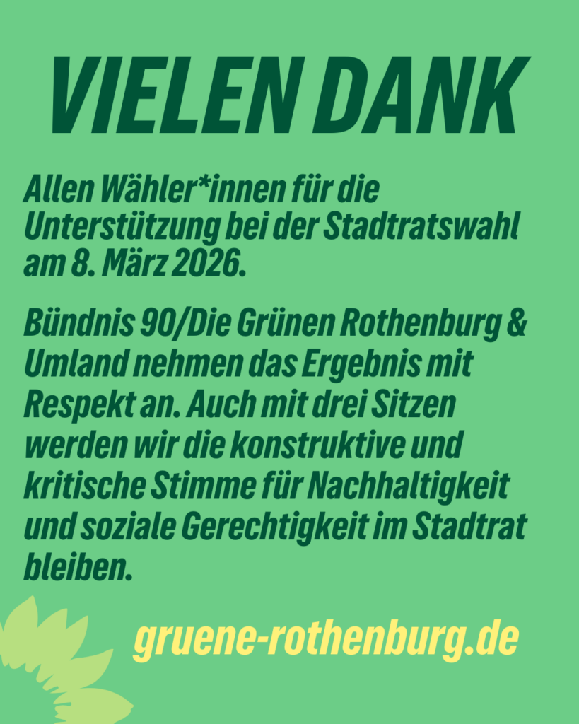 Bündnis 90/Die Grünen Rothenburg & Umland nehmen das Wahlergebnis mit großem Respekt an. Auch wenn wir künftig mit drei Sitzen im Gremium vertreten sind, versprechen wir euch: Wir bleiben die konstruktive und kritische Stimme für Nachhaltigkeit, Klimaschutz und soziale Gerechtigkeit in unserer Heimatstadt.
